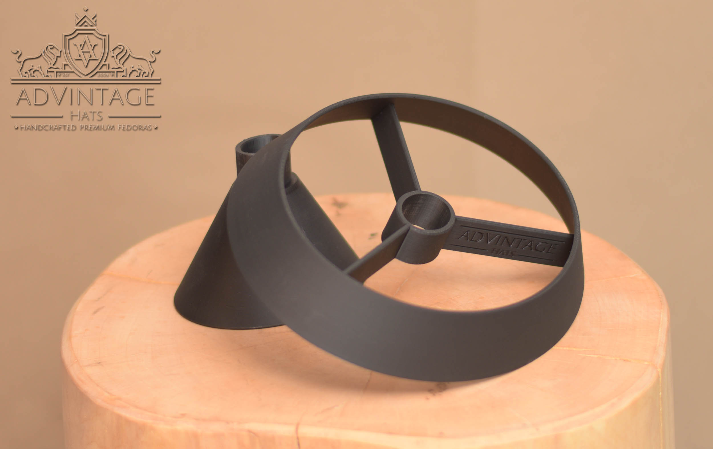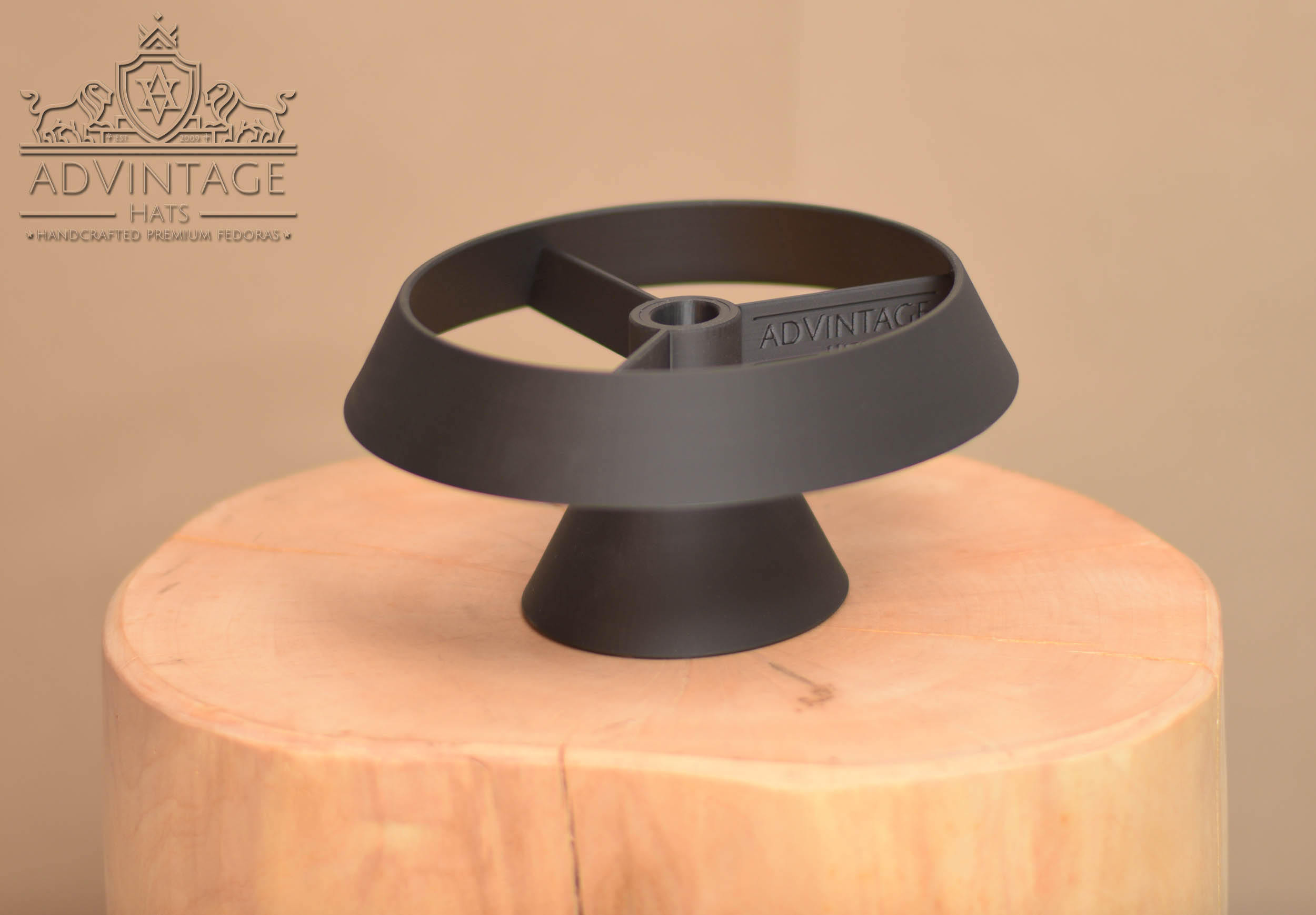 Hutständer aus schwarzem Kunststoff, passend für Hutgrößen von 55cm bis 62cm. Ideal für Fedoras und Western-Hüte mit gebogener Krempe, da diese den Untergrund nicht berührt und sich nicht verformen kann.